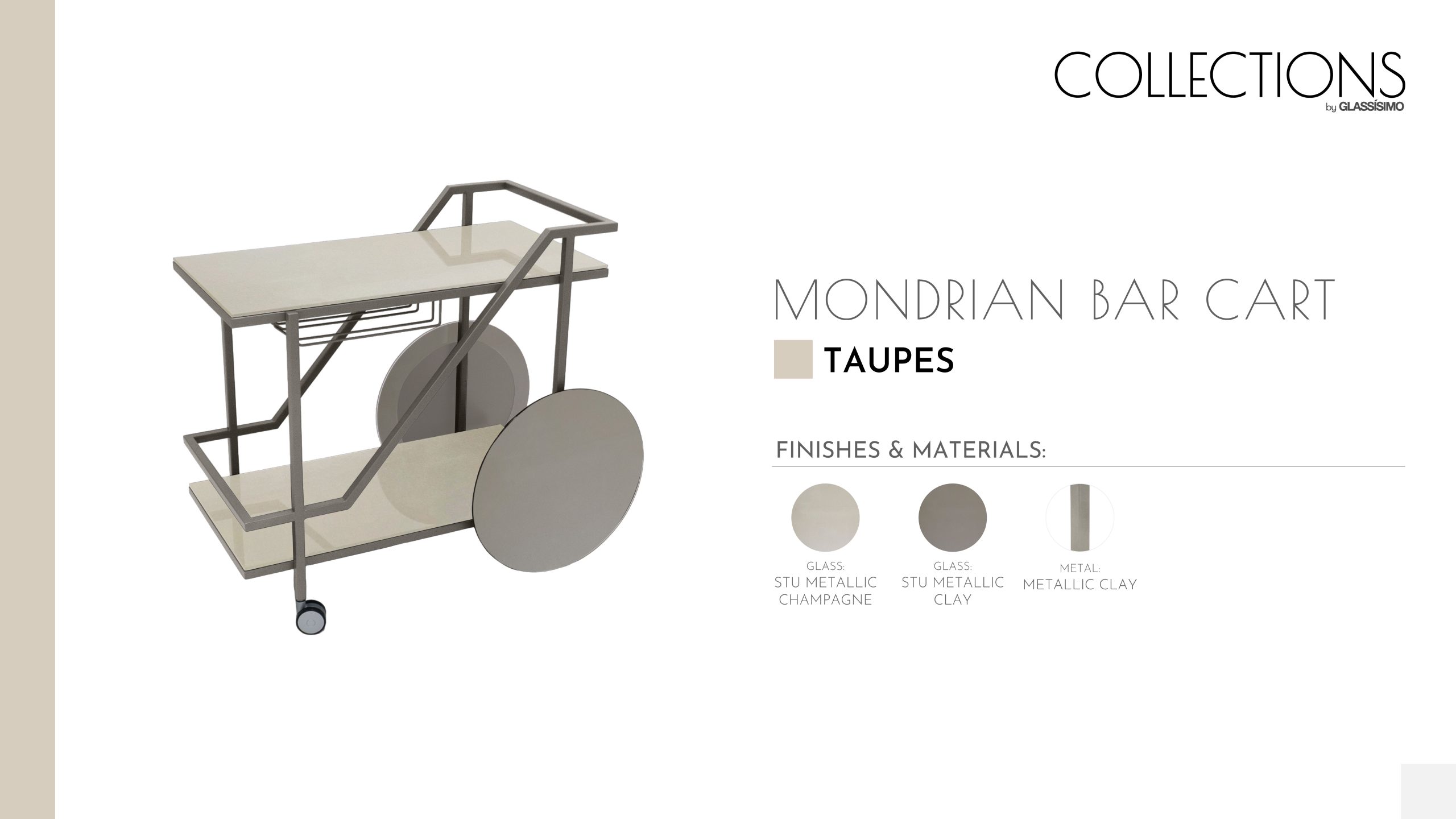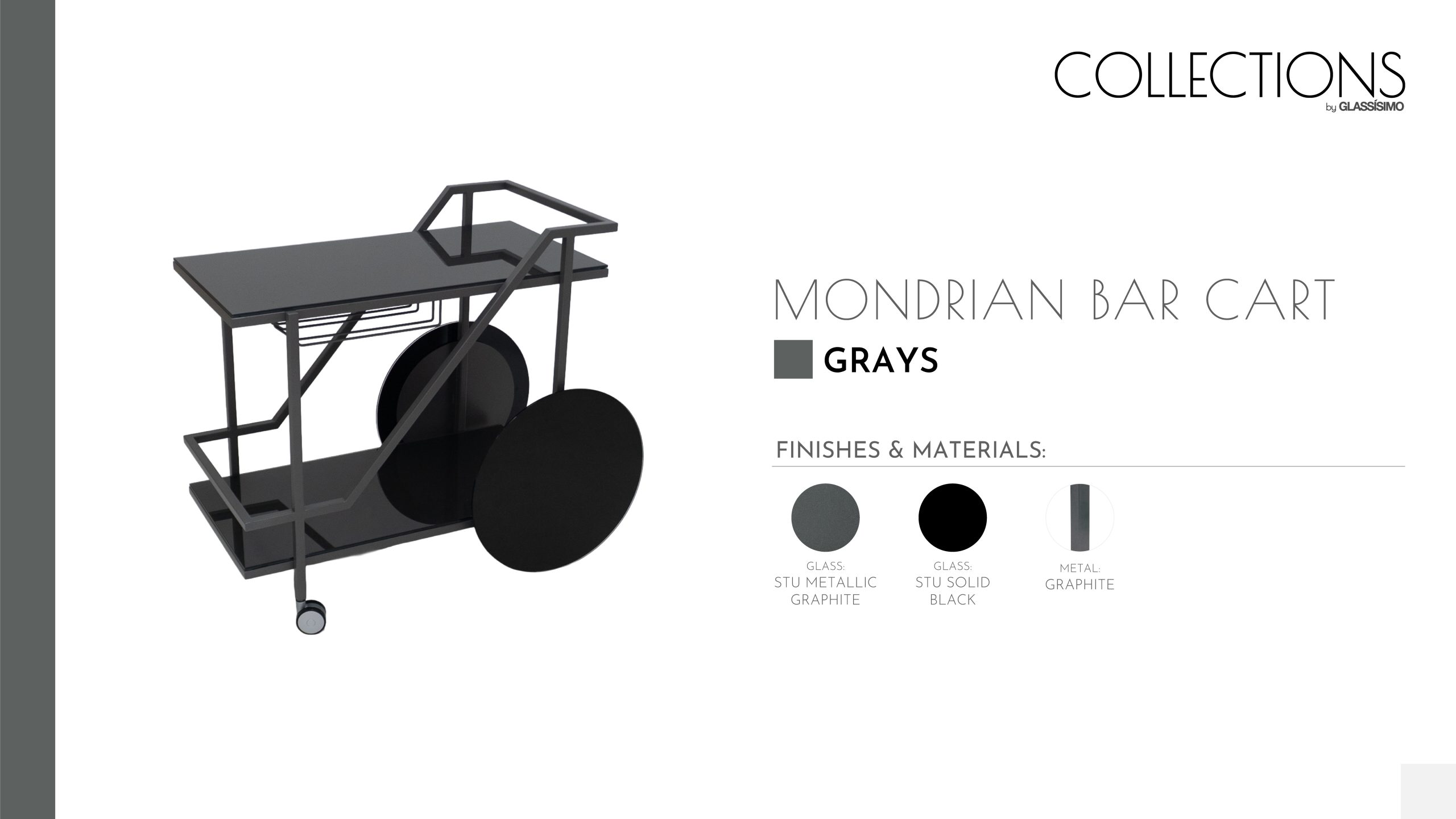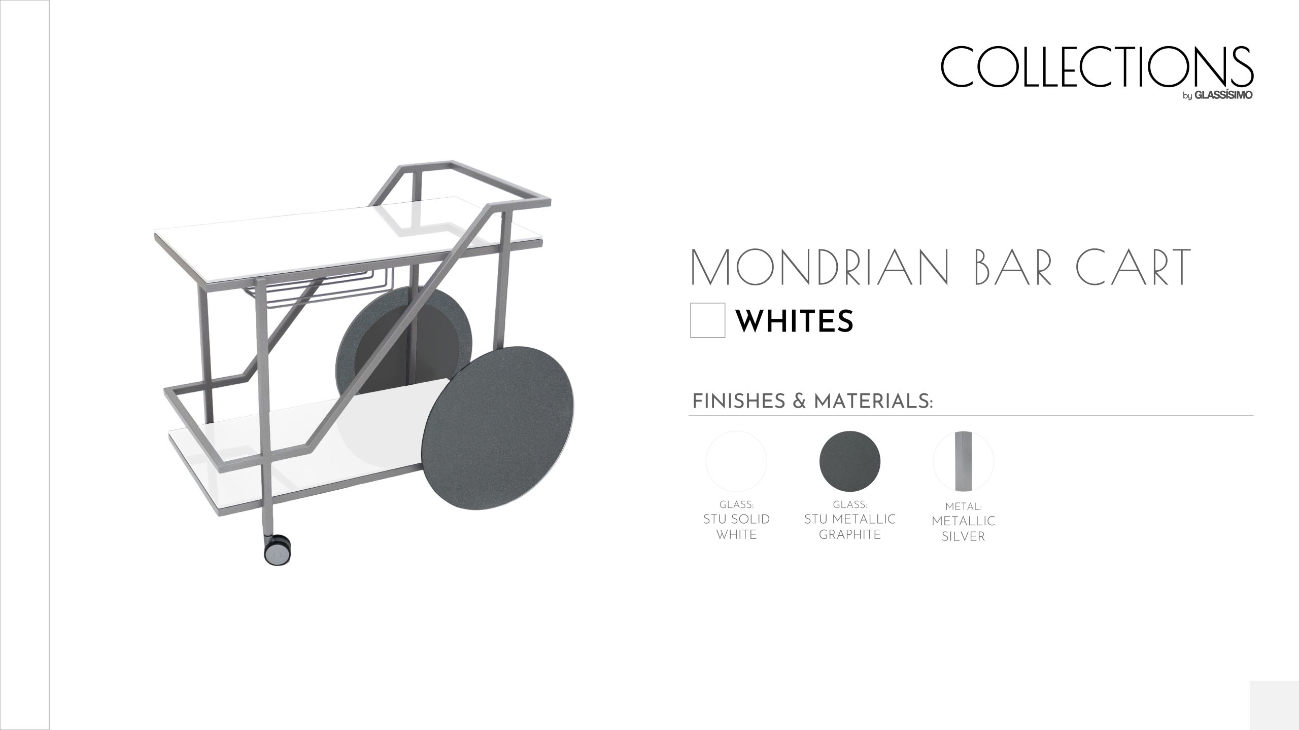 6 mm extraclear tempered glass. Metal frame. Plastic casters. Wine glass holder.
