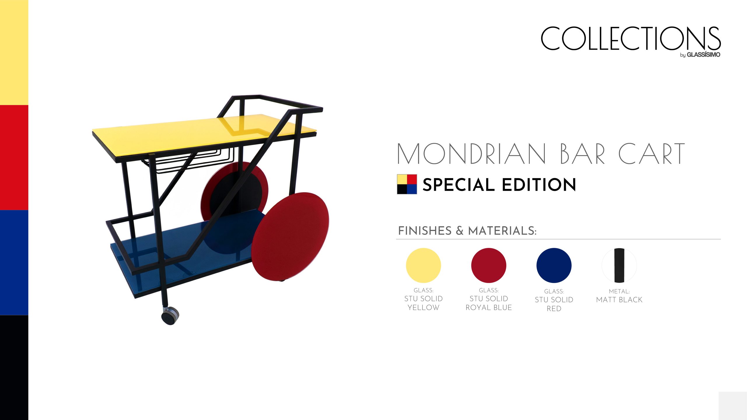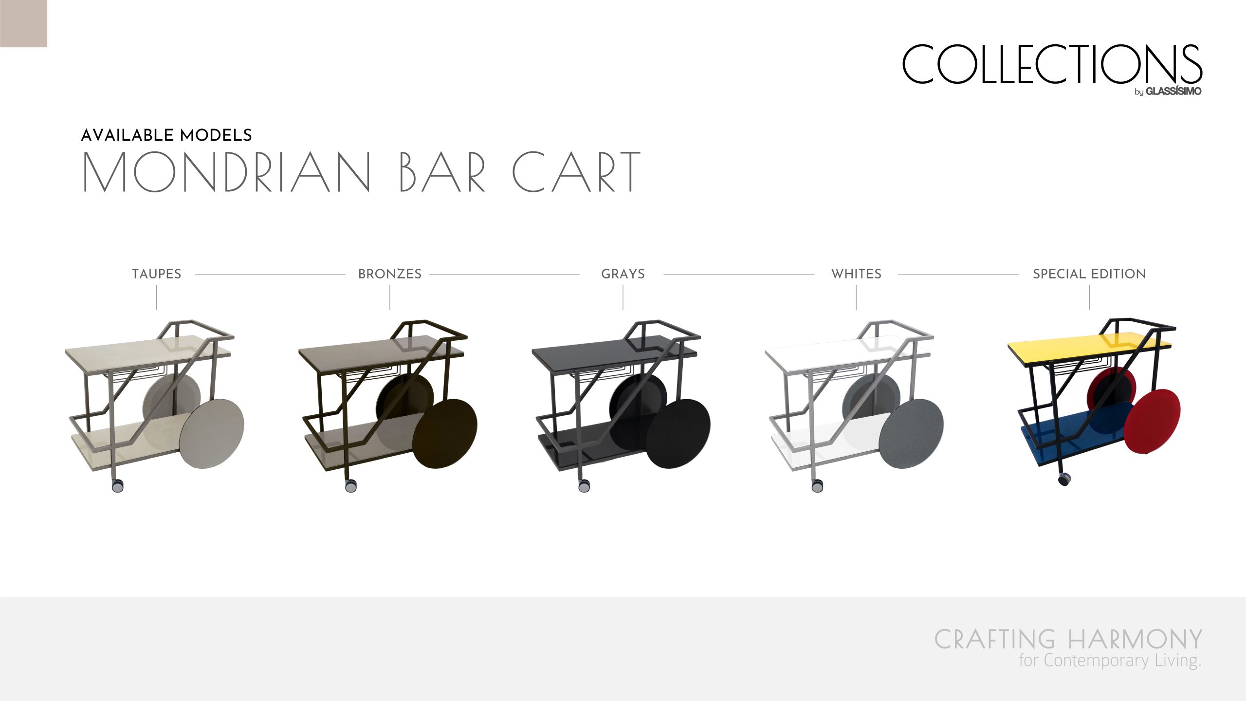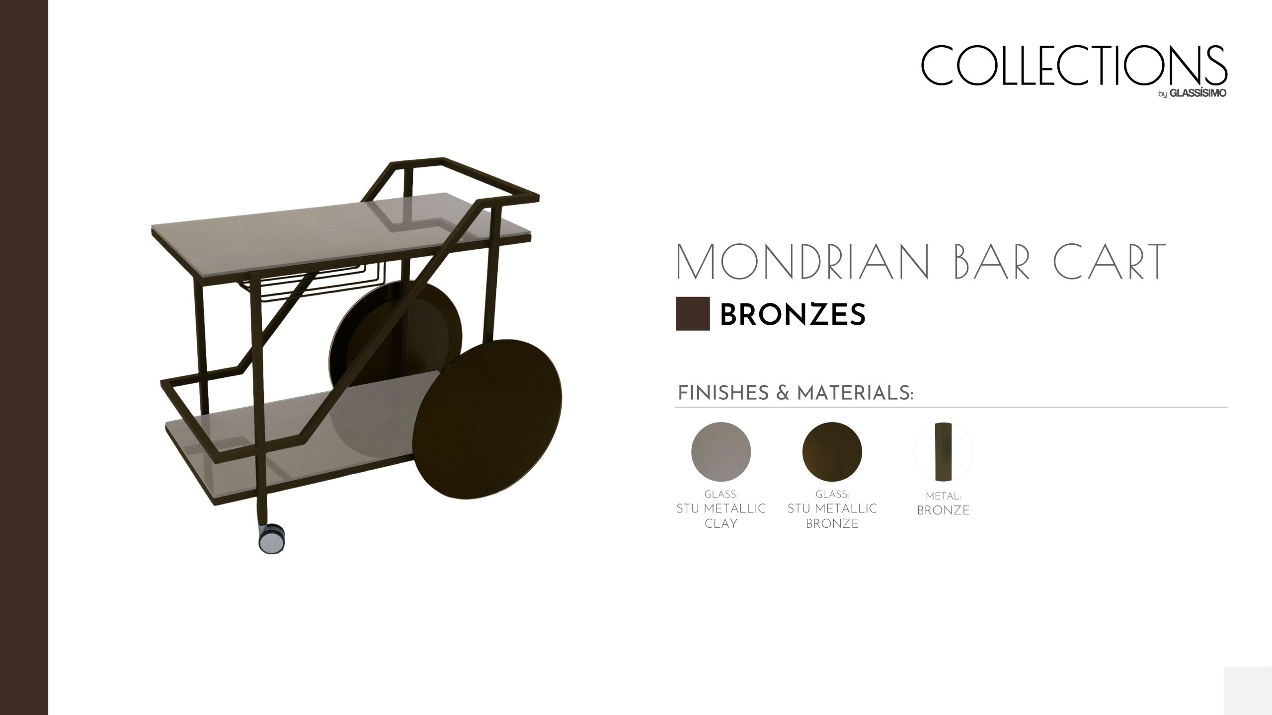 6 mm extraclear tempered glass. Metal frame. Plastic casters. Wine glass holder.