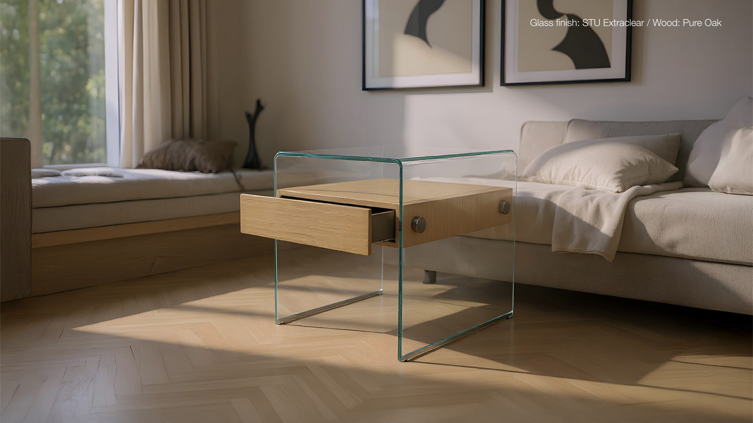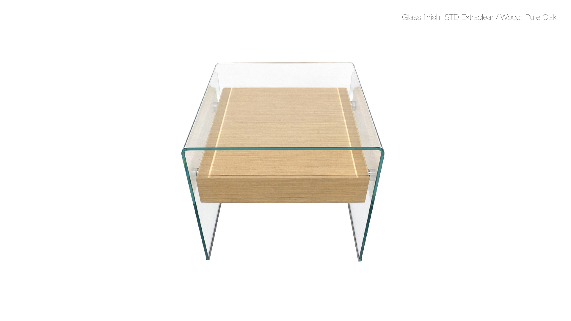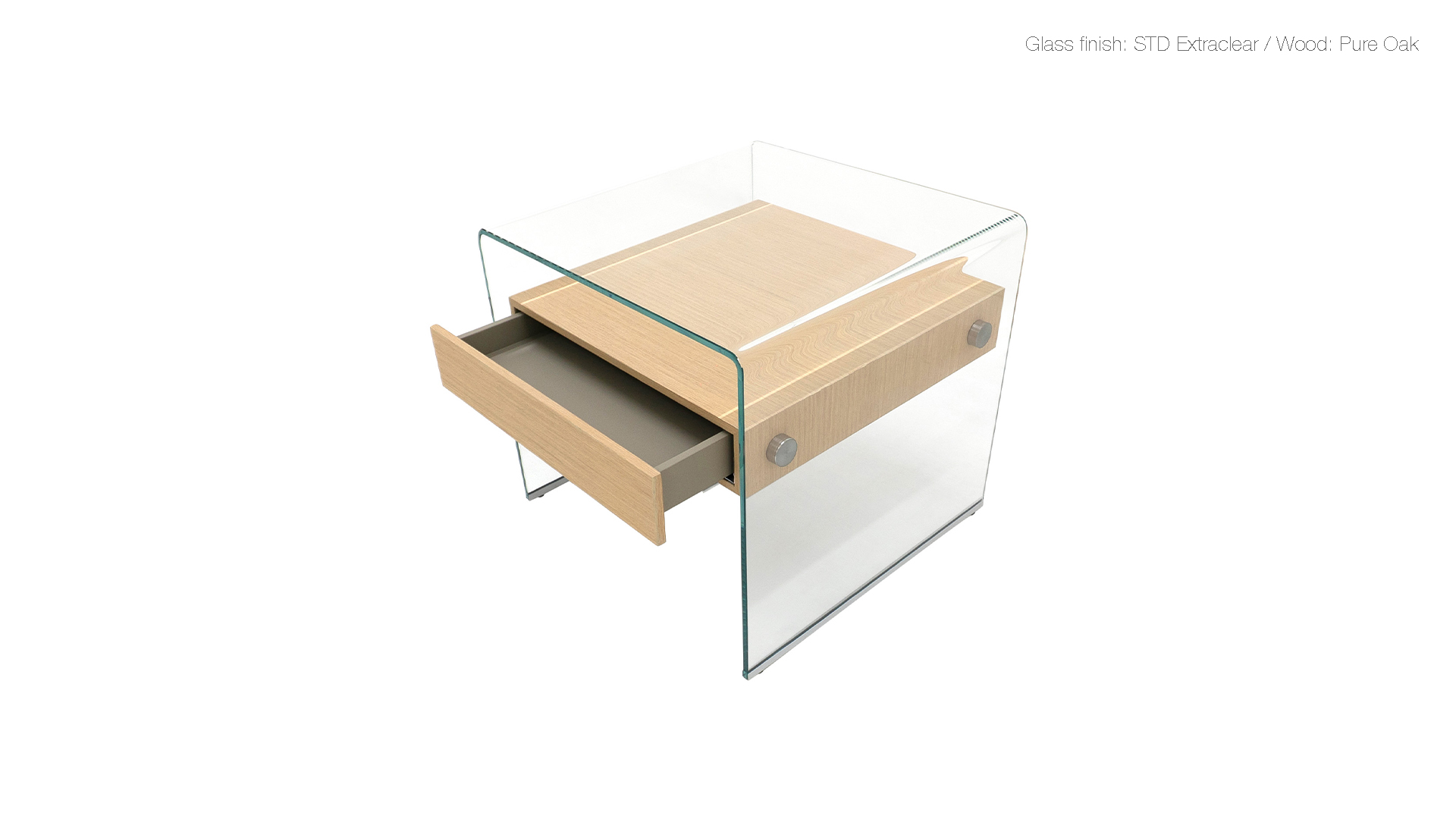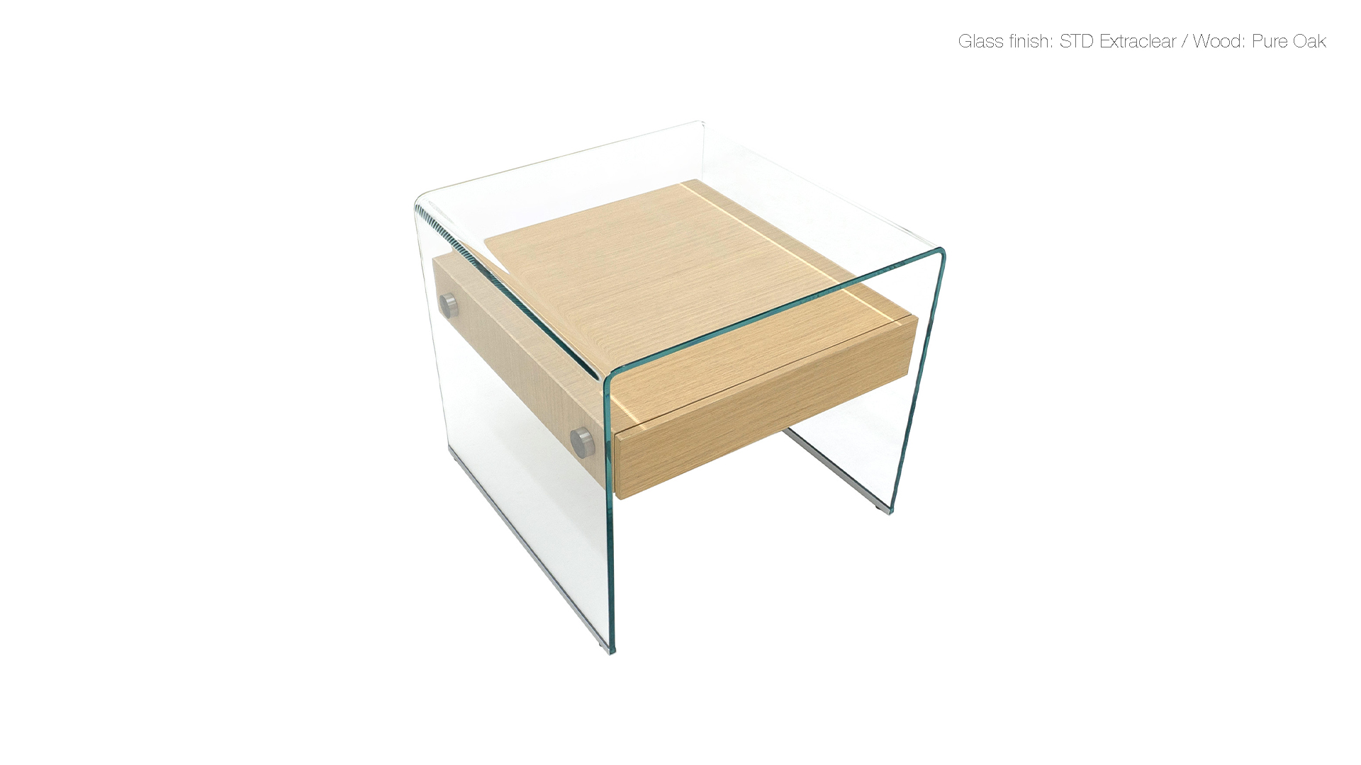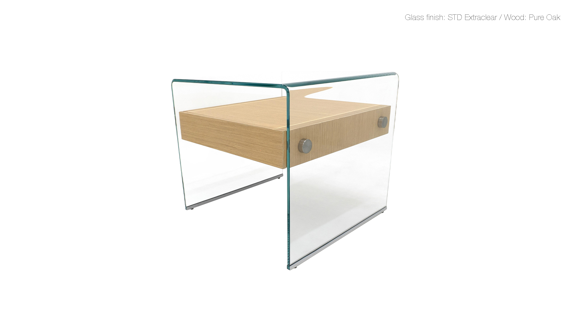 10mm extraclear bent glass. Anodized Aluminum support rails for bottom glass edge with plastic bumpers. Drawer with concealed runners and soft close. Stainless Steel fixtures with UV adhesive.